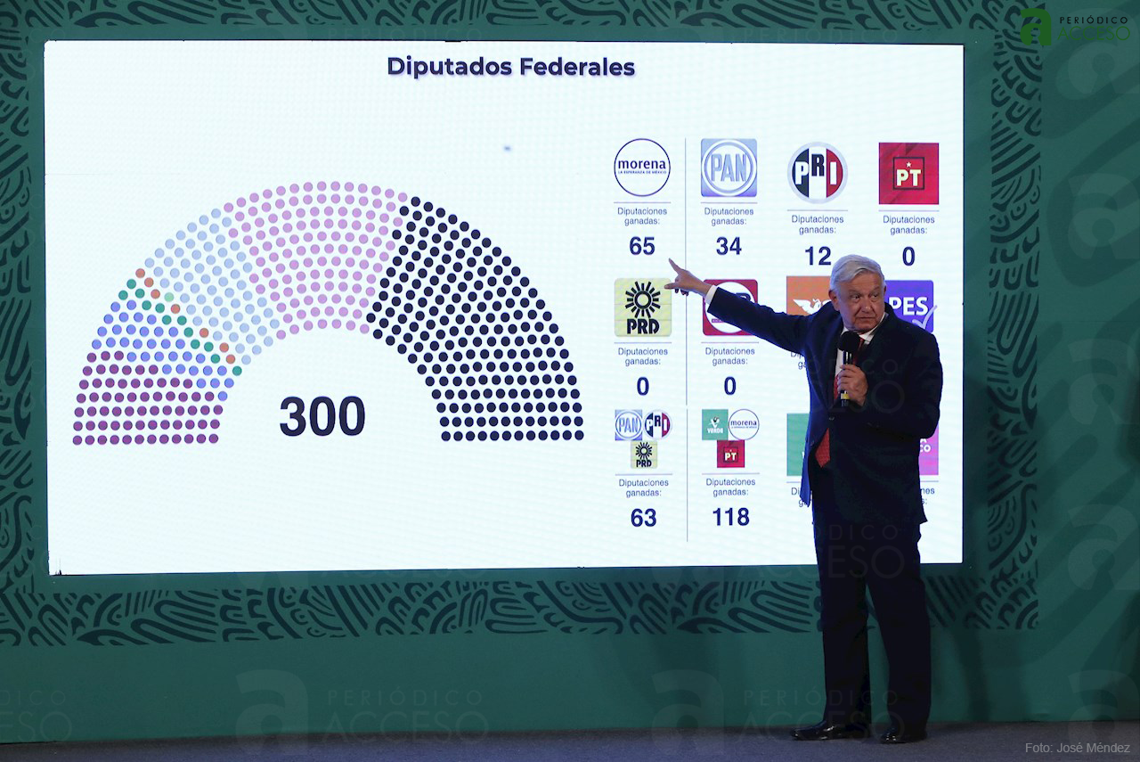 Según los datos preliminares, Morena obtuvo entre 190 y 203 escaños de la Cámara Baja, un dato sustancialmente menor a los 253 diputados que ostenta actualmente.
