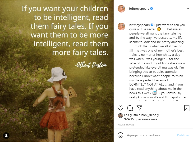 Spears, que en los últimos años ha utilizado Instagram como única vía de contacto con sus seguidores, publicó una imagen con una cita atribuida a Albert Einstein sobre cuentos de hadas, algo que considera que ha estado transmitiendo al público.