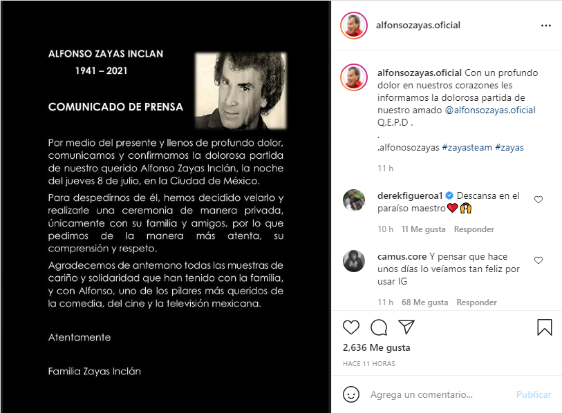 «Por medio del presente y llenos de un profundo dolor, comunicamos y confirmamos la dolorosa partida de nuestro querido Alfonso Zayas Inclán la noche del jueves 8 de julio», se lee por medio de un boletín publicado en sus redes sociales firmado por la familia Zayas Inclán.