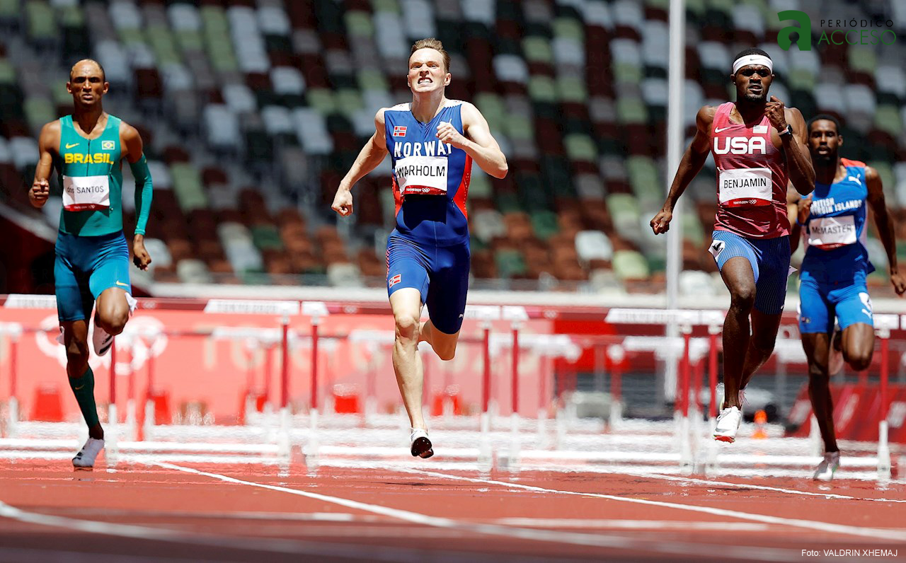 En la hora suprema de la final olímpica, Warholm ha ratificado su hegemonía y Benjamin le ha obligad a batir el récord del mundo si quería ganar la medalla de oro, porque el estadounidense se emparejó con el noruego a media recta final, poco antes de atacar el último obstáculo.