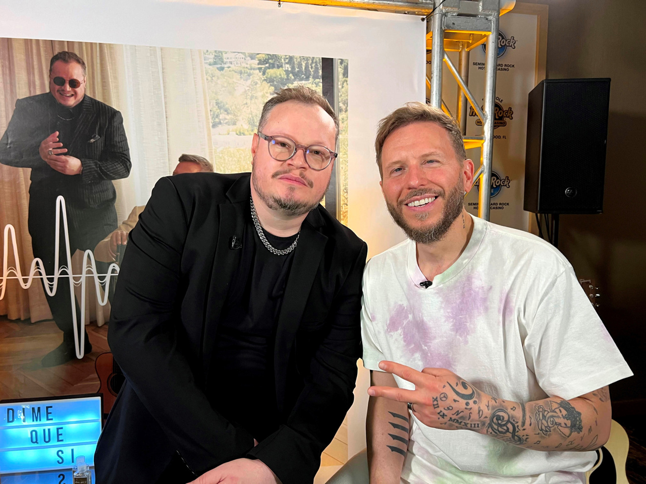 Schajris y García, que forman uno de los dúos más reconocidos de la música pop en español, especialmente por sus baladas, aparecen vestidos de negro y ambos con barba incipiente.