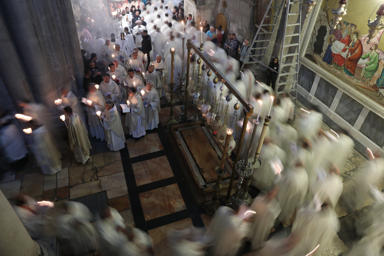 La jornada empezó a primera hora con una misa matutina en el Santo Sepulcro, el lugar más sagrado del cristianismo, donde la tradición marca la crucifixión de Jesucristo y su posterior resurrección.