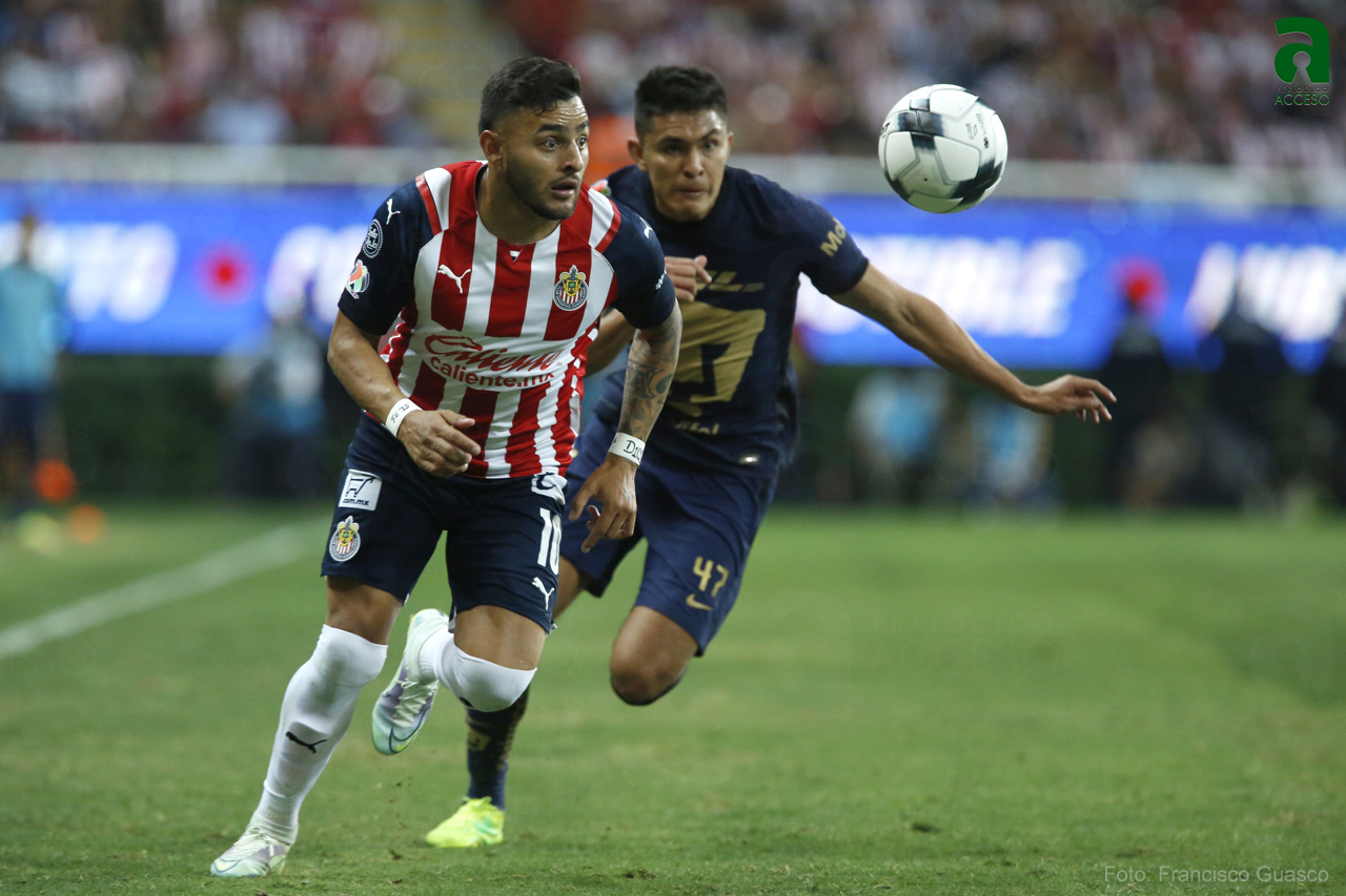 Las Chivas se adelantaron en su primera llegada al área de los Pumas. Al minuto 12, Jesús Orozco metió un servicio detrás de la media cancha que Calderón convirtió en el 1-0 ante la salida del guardameta Alfredo Talavera.