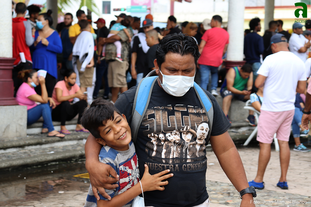 La caravana se detuvo en el municipio de Huixtla en busca de un acuerdo con el Instituto Nacional de Migración (INM) para conseguir documentos para este grupo de extranjeros que marchó más de 42 kilómetros desde Tapachula (frontera con Guatemala) en las últimas 48 horas.