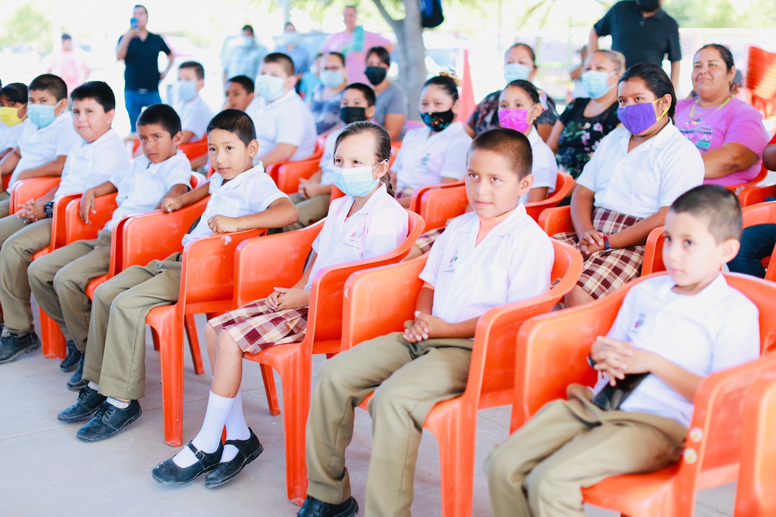 Acuña, Coah., 27 de junio de 2022.- A petición de la directiva de la Escuela Primaria Rural “Presidente Benito Juárez García”, del ejido El Pilar, dependencias municipales llevaron acciones y servicios a este plantel dentro del programa “Contigo en la Escuela”, que congregó a la comunidad estudiantil y madres de familia; a su directora y maestra del grupo unitario, Dominga Palacios Carrillo y a la supervisora de la Zona Escolar 411, Patricia Banda Roque.