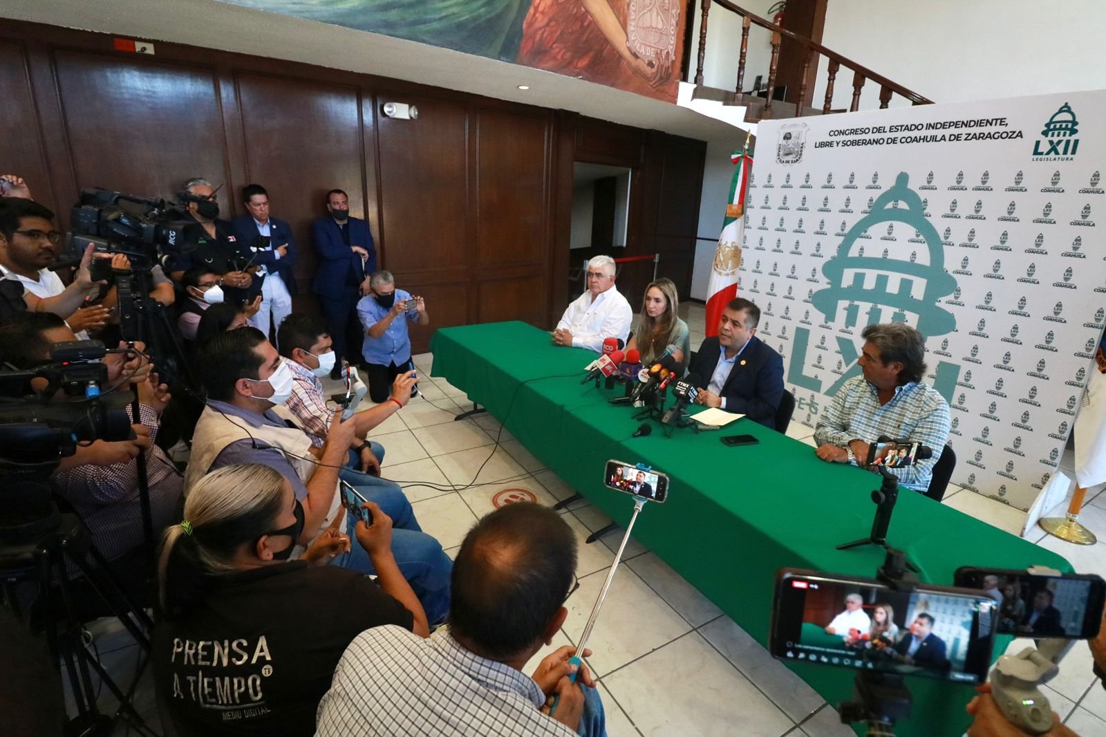 Saltillo, Coahuila, 03 agosto 2022.- En las instalaciones del Congreso Local y reunidos en conferencia de prensa, los diputados Eduardo Olmos Castro, presidente de la Junta de Gobierno, el diputado Jorge Abdala Serna, presidente de la Diputación Permanente, la diputada Edna Dávalos Elizondo, coordinadora de la comisión de Auditoría Gubernamental y Cuenta pública, así como el diputado Ricardo López Campos, coordinador de la comisión de Gobernación, dieron a conocer el proceso legislativo que se seguirá posterior a la emisión de la convocatoria para elegir a la persona que fungirá como titular de la Auditoría Superior del Estado, lo anterior tras la separación anticipada del cargo del C.P.C José Armando Plata Sandoval, quien permanecerá en funciones hasta en tanto se concluya el proceso de selección.