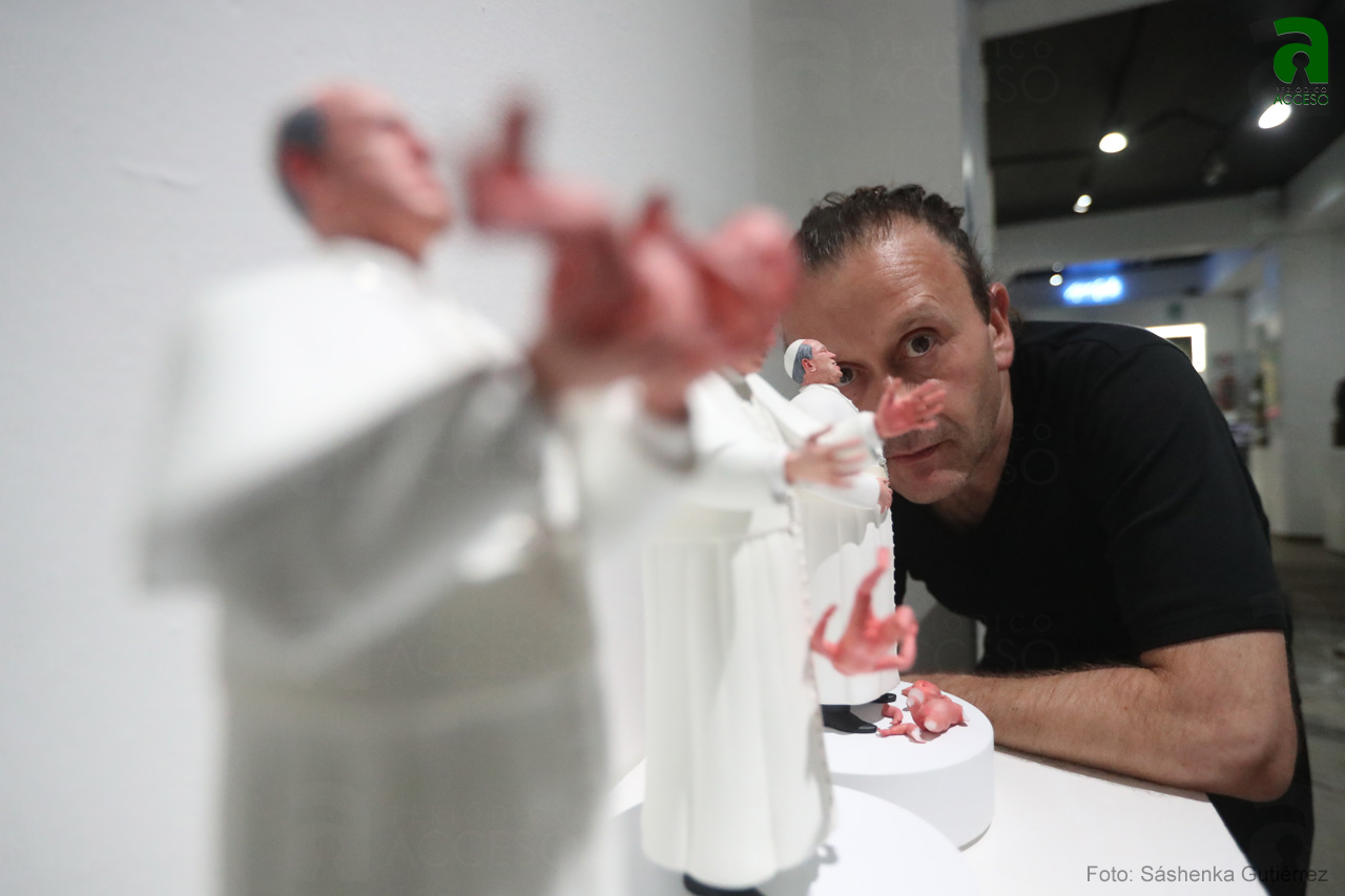 En la obra expuesta en la Aguafuerte Galería de la capital mexicana, titulada «Chao tradición», en la primera figura aparece el papa arrullando a un bebé; en la segunda, el bebé es soltado por el pontífice y cae, y en la tercera aparece en el piso destrozado con el jerarca católico en risa plena.