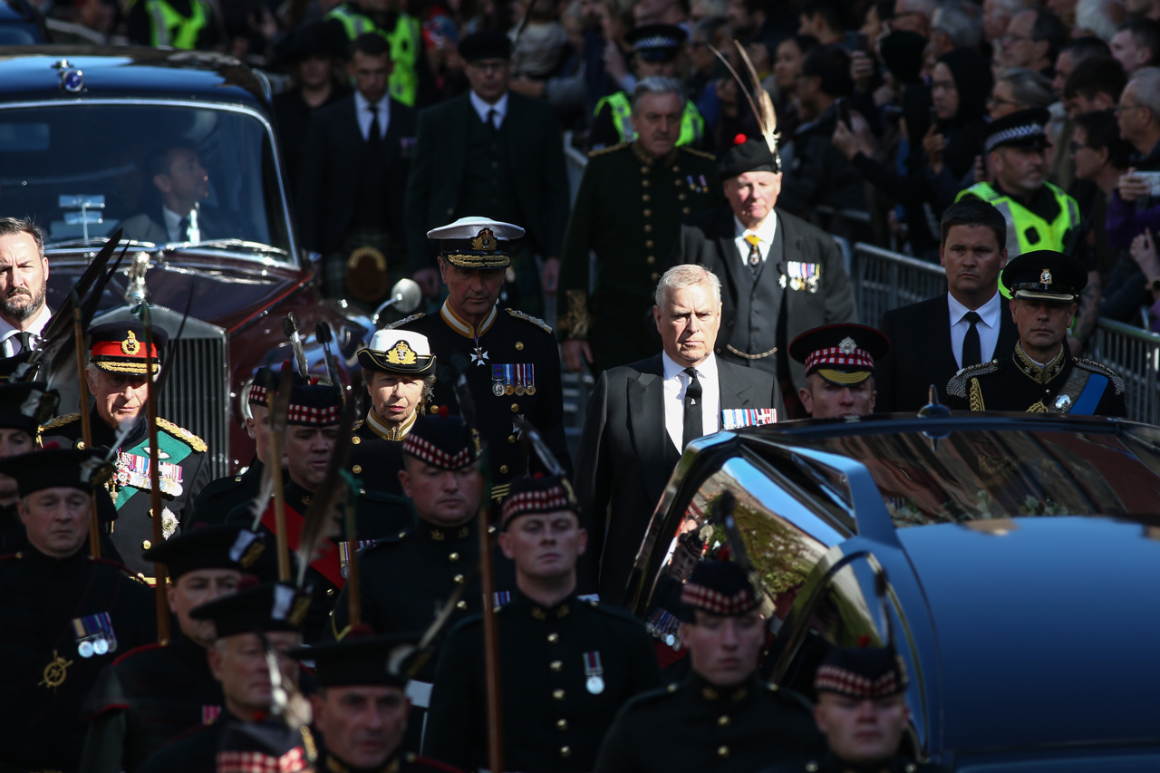 Por detrás del féretro, cubierto con el estandarte real de Escocia y una corona de flores, van a pie el rey Carlos III, la princesa Ana; el duque de York, Andrés, y el conde de Wessex, Eduardo, los cuatro hijos de Isabel II y el duque de Edimburgo, en un ambiente de respetuoso silencio de la gente congregada en el lugar.