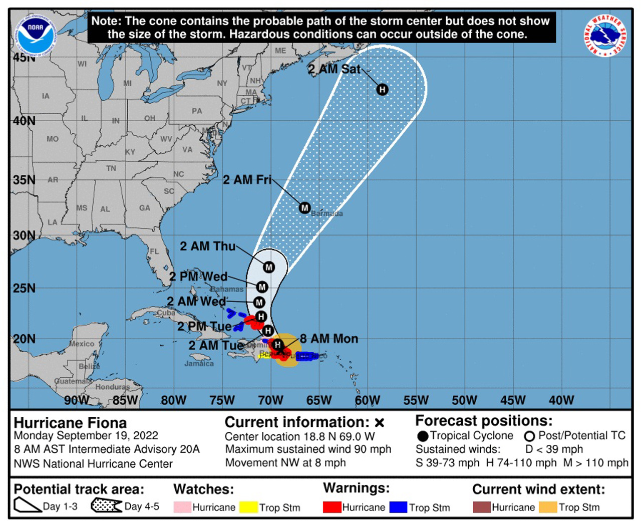 En la trayectoria pronosticada, el centro de Fiona se moverá sobre la parte este de la República Dominicana esta mañana y emergerá sobre el suroeste del Atlántico esta tarde.