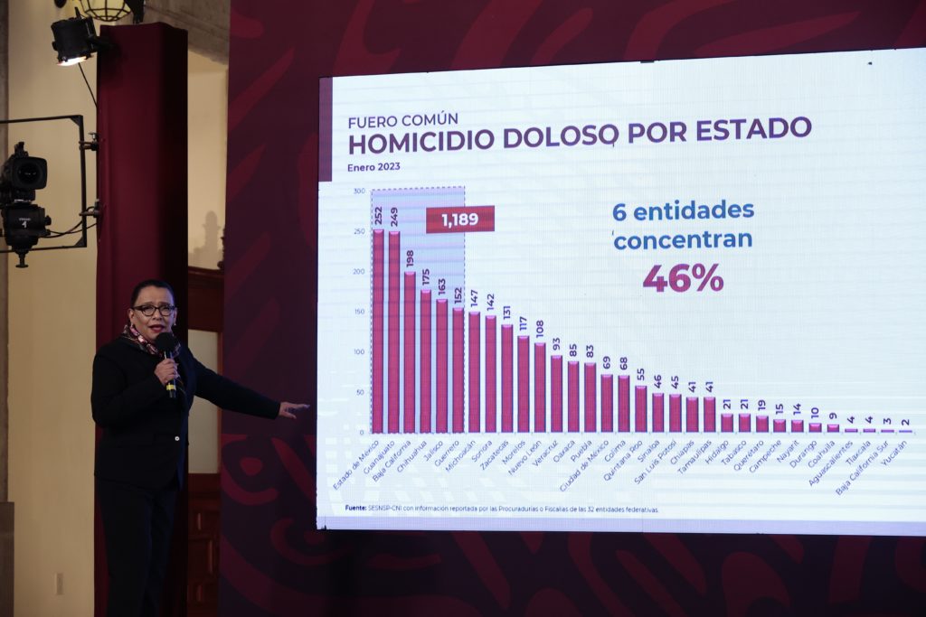 Rodríguez expuso que seis estados concentran casi la mitad de los homicidios: Estado de México, Guanajuato, Baja California, Chihuahua, Jalisco y Guerrero, que en conjunto representaron 1.189 de estos crímenes.