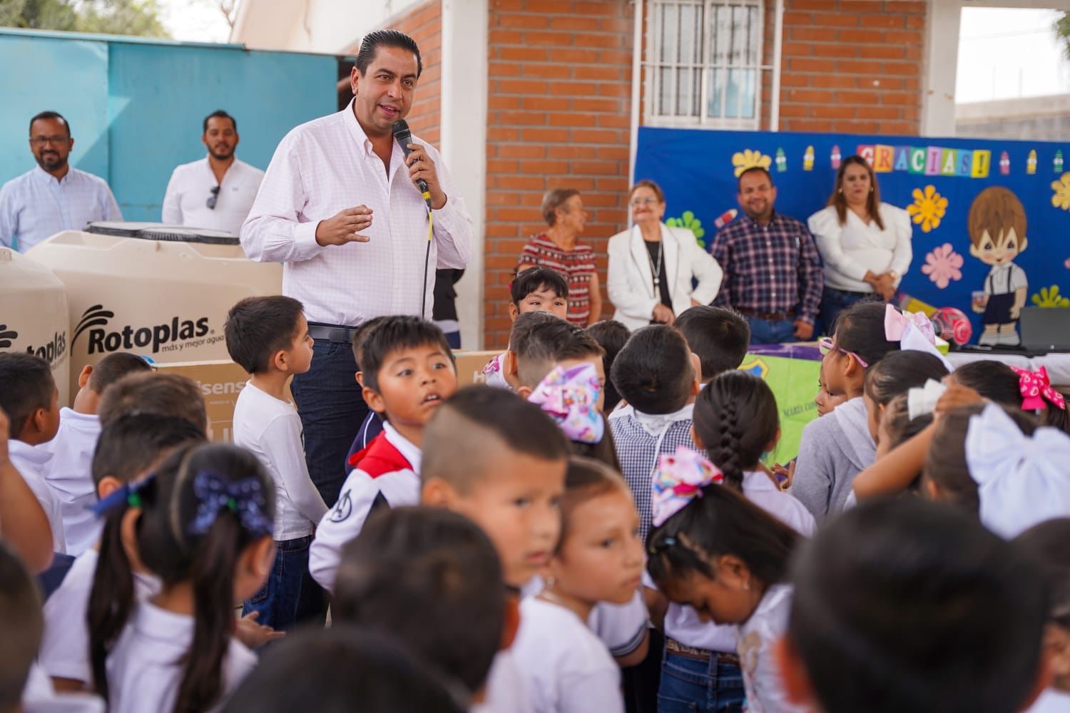 Al preescolar se hizo llegar equipo multifuncional, laptop, pantallas de 55 pulgadas y soportes, micrófonos inalámbricos y pedestales, además de sanitarios con tapa y herrajes y dos tinacos con bomba.