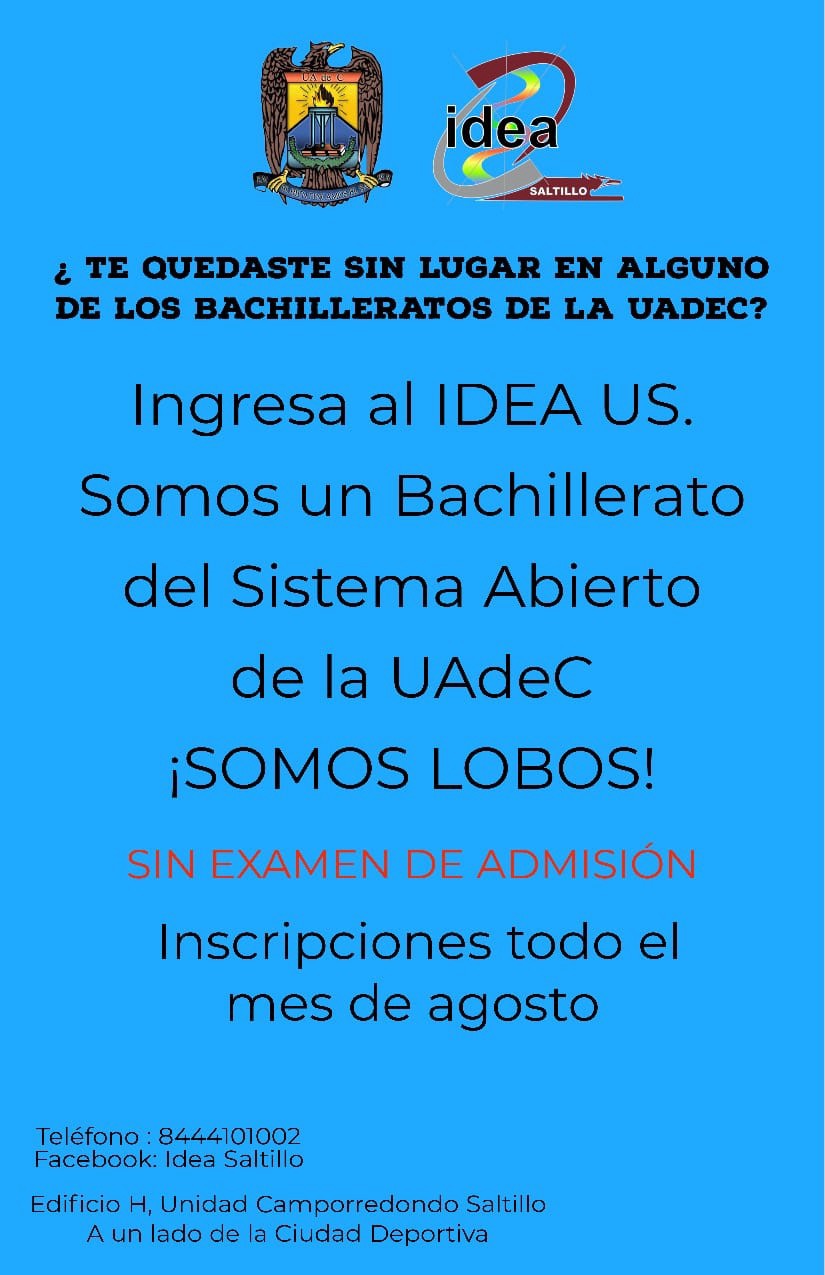 Para más información llamar al teléfono (844) 410 10 02, visitar la página de Facebook IDEA Saltillo, ingresar al sitio http://www.ideasal.uadec.mx, o directamente en el plantel en un horario de lunes a viernes de 9:00 a 20:00 horas.