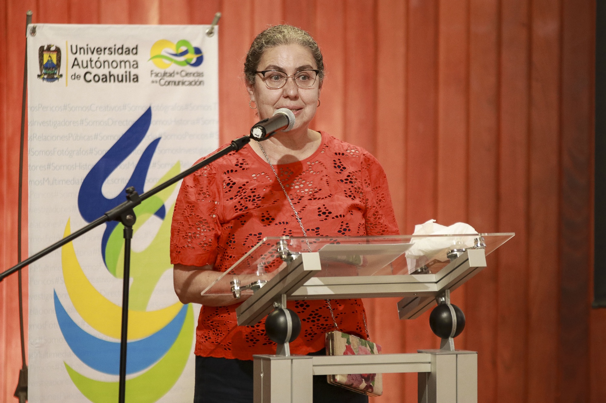 SALTILLO, Coahuila. 30 de agosto de 2024. Como parte de las actividades por el 44 aniversario de la Facultad de Ciencias de la Comunicación (FCC) de la Universidad Autónoma de Coahuila, se rindió un homenaje a la Dra. Julieta Carabaza González por 33 años de servicio en el plantel.