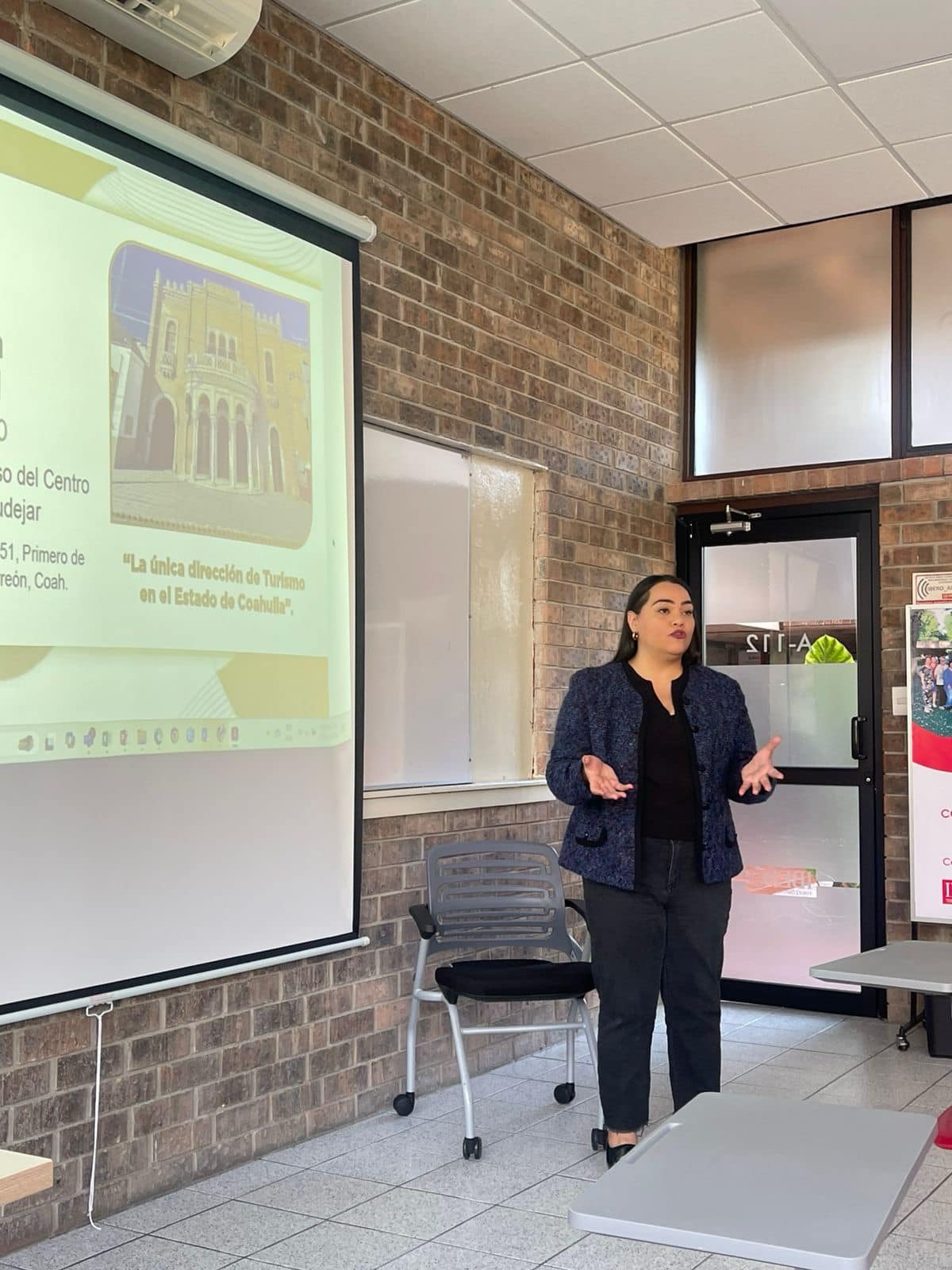 Guadalupe Molina Sánchez, auxiliar de comunicaciónde la dirección, se encargó de exponer ante los estudiantes las acciones del Municipio para la promoción de Torreón.