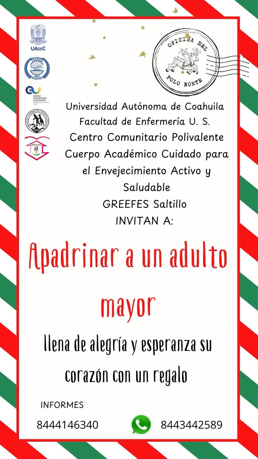 SALTILLO, Coahuila. 27 de noviembre de 2024. La Universidad Autónoma de Coahuila a través de Estudiantes de Enfermería para el Fomento del Envejecimiento Saludable Saltillo (GREEFES), en Coordinación con el Centro Comunitario Polivalente “Francisco Villa”, invitan a la comunidad universitaria y público en general a Apadrina un Adulto Mayor con un Regalo.