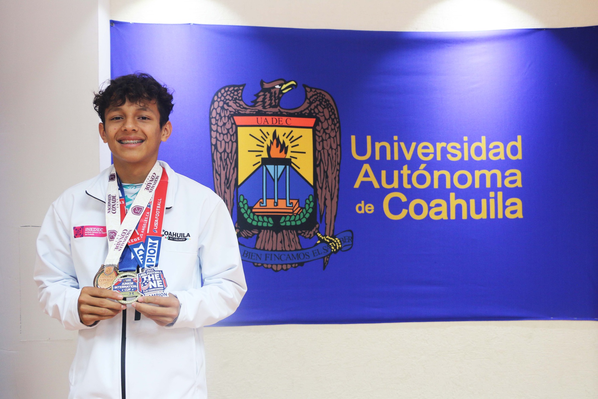 La máxima casa de estudios se enorgullece en contar entre sus Lobos con un joven que también recibió el Premio Municipal del Deporte, por su campeonato como equipo representativo de México y Coahuila en la NFL Flag Championship Categoría U-14 al vencer a Canadáel pasado mes de julio, en Hall of Fame Village en Canton, Ohio, en donde fue nombrado el jugador más valioso de la final «Most Valuable Player” (MVP).