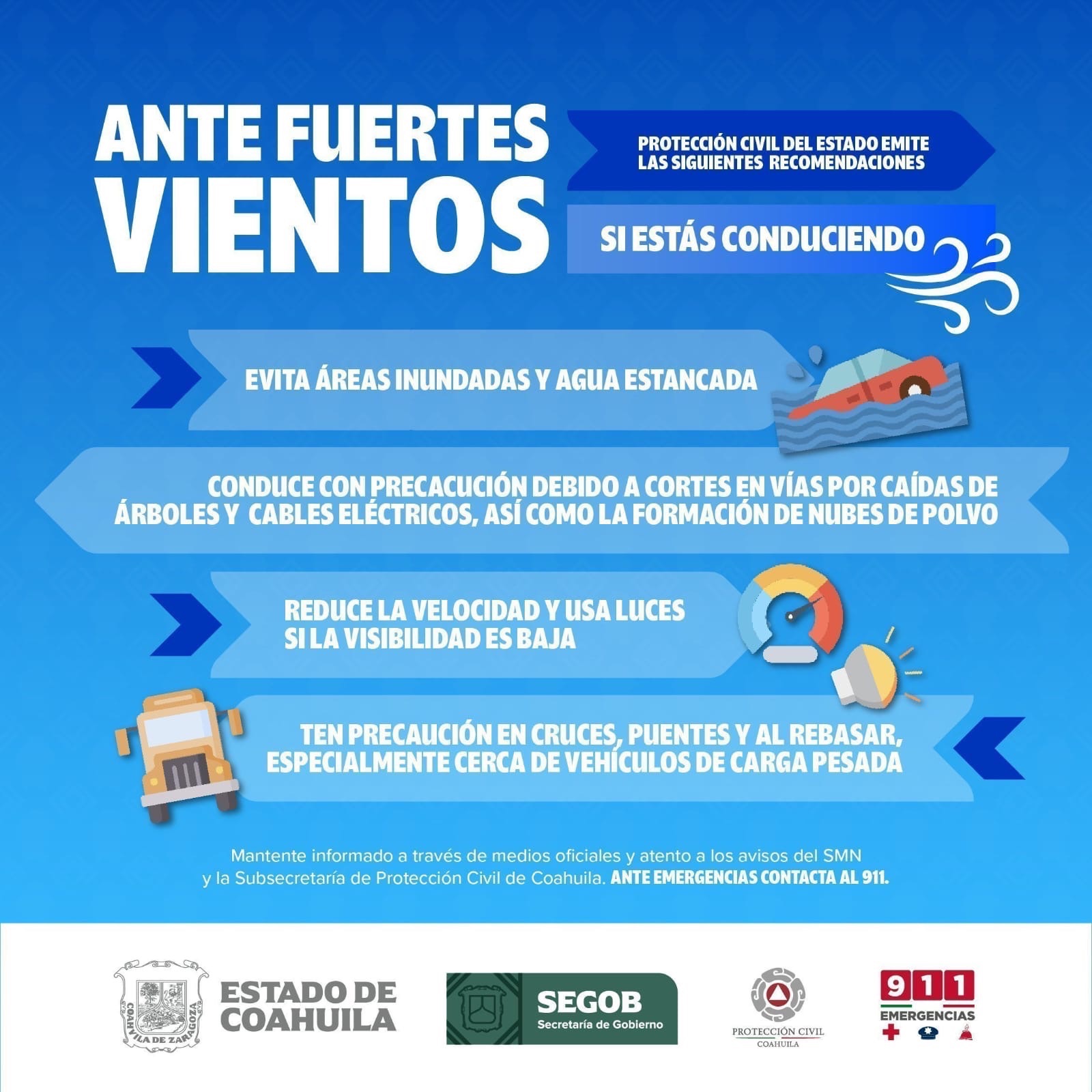 Manténgase informado por los medios oficiales de comunicación y atento a los avisos que emita el Servicio Meteorológico Nacional y la Subsecretaría de Protección Civil de Coahuila.