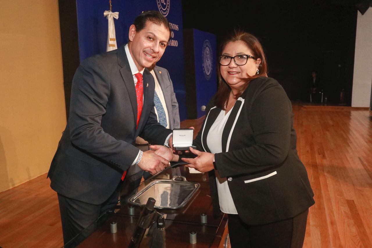 “A los maestros se les entrega la medalla Miguel Ramos Arizpe, por 10 años de labor docente y haber tenido un desempeño destacado, de igual manera la Medalla Juan Antonio de la Fuente a las y los estudiantes que obtuvieron los promedios más altos en cada uno de los programas académicos que ofertamos, porque ellos son muestra del talento que nuestra institución genera en favor de Coahuila, México y el mundo, también se reconoce con el Diploma al Mérito Universitario a las y los docentes con más de 20 años de servicio ininterrumpido en la UAdeC, por su dedicación y constancia y por primera vez el Diploma al Mérito Científico”, dijo.