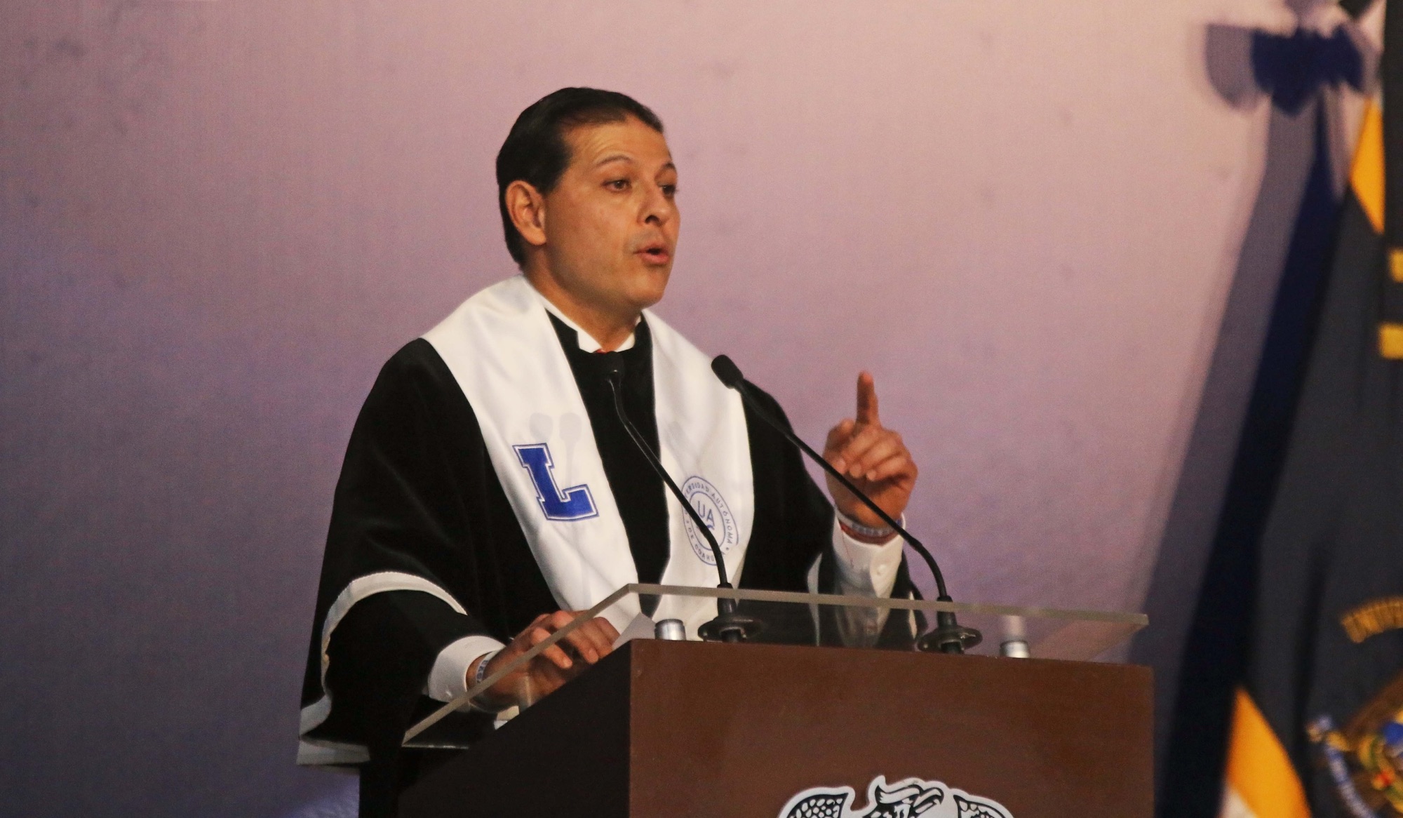 Felicitó a las familias de los galardonados por su apoyo en el camino académico de sus seres queridos; enfatizó que tanto Narro Robles como Fuentes García han vivido intensamente y han dedicado sus vidas al servicio de la comunidad, inspirando a todos con sus ejemplos de dedicación y valentía.