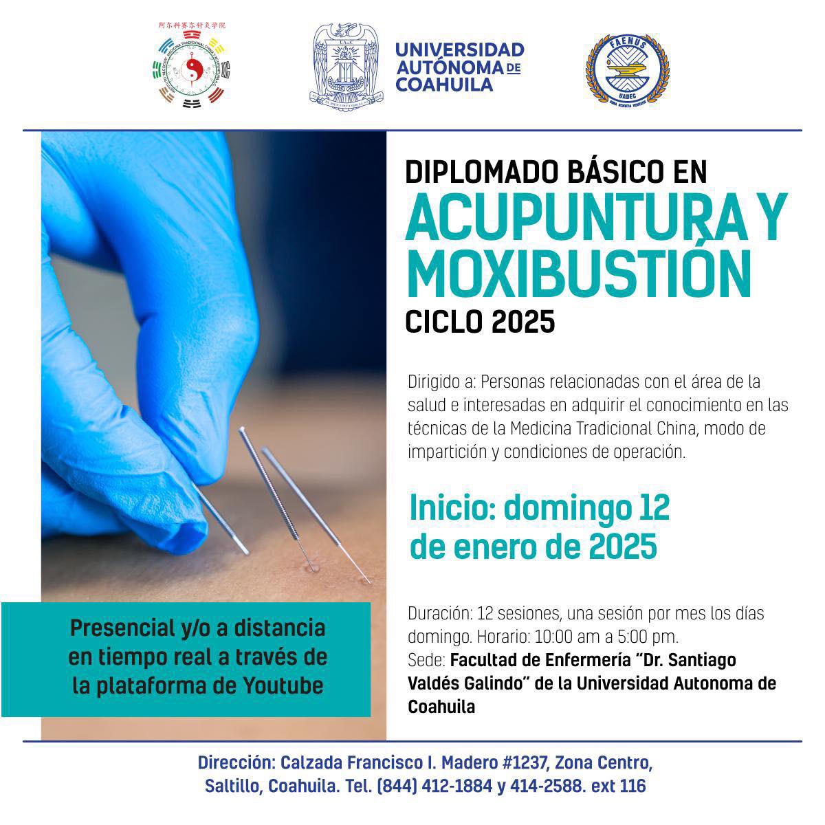 SALTILLO, Coahuila. 7 de enero de 2025. La Universidad Autónoma de Coahuila a través de la Facultad de Enfermería “Dr. Santiago Valdés Galindo” Unidad Sureste, en conjunto con el Instituto Alcocer Medicina Tradicional China y Acupuntura A.C, invitan al Diplomado Básico en Acupuntura y Moxibustión Ciclo 2025, que iniciará el próximo 12 de enero y que está dirigido a todos los interesados en adquirir el conocimiento de las técnicas de la Medicina Tradicional China.