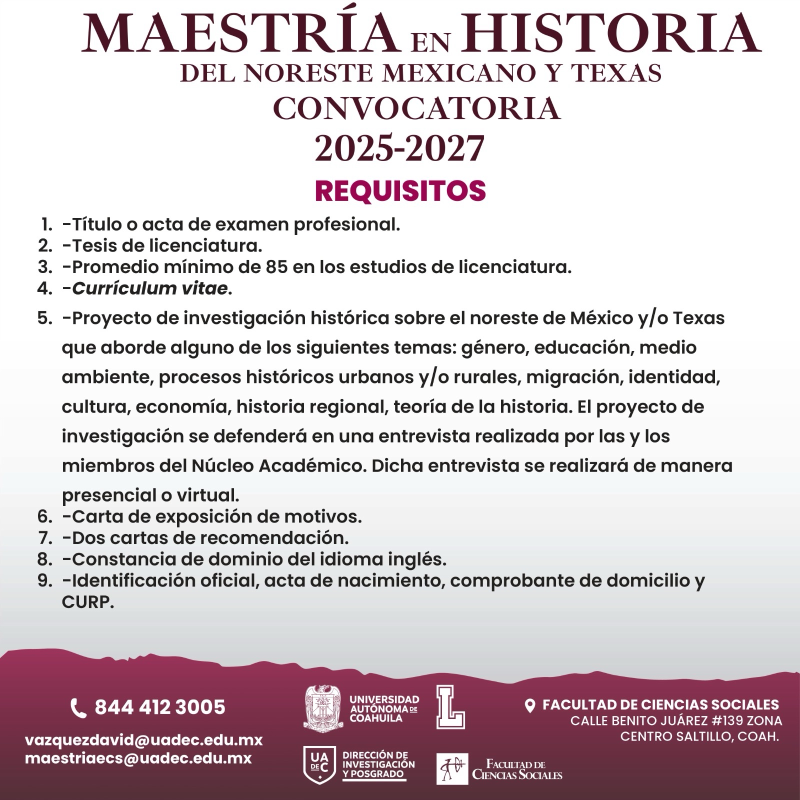 Los requisitos que deben cumplir son: Título o acta de examen profesional, tesis de licenciatura, documento que demuestre que obtuvo un promedio mínimo de 85 en sus estudios de licenciatura, currículum vitae, proyecto de investigación histórica sobre el noreste de México y/o Texas que aborde algunos de los siguientes temas: género, educación, medio ambiente, procesos históricos urbanos y/o rurales, migración, identidad, cultura, economía, historia regional y teoría de la historia.