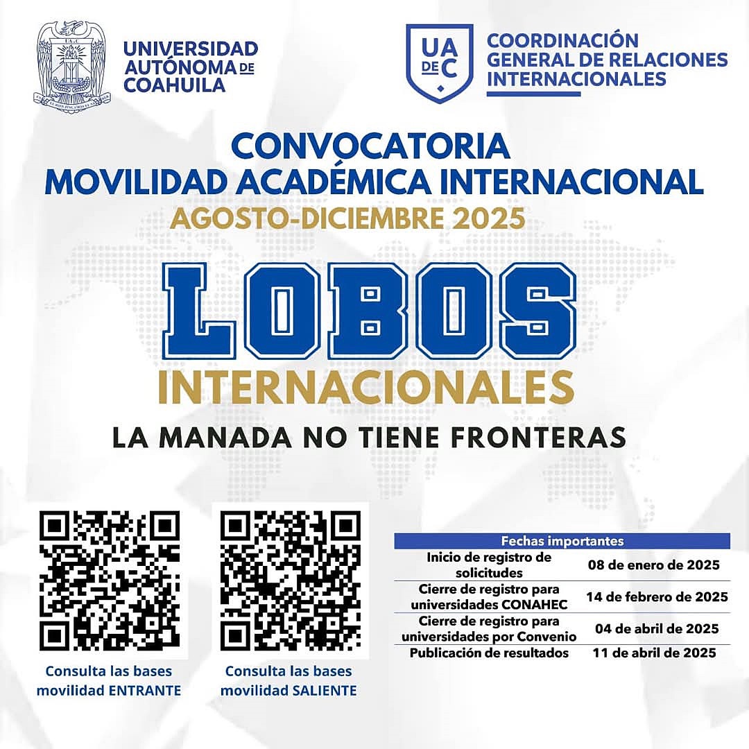 SALTILLO, Coahuila. enero de 2024. La Universidad Autónoma de Coahuila a través de la Coordinación General de Relaciones Internacionales,invita a registrarse en la convocatoria de movilidad académica internacional entrante y saliente para el periodo agosto-diciembre 2025.