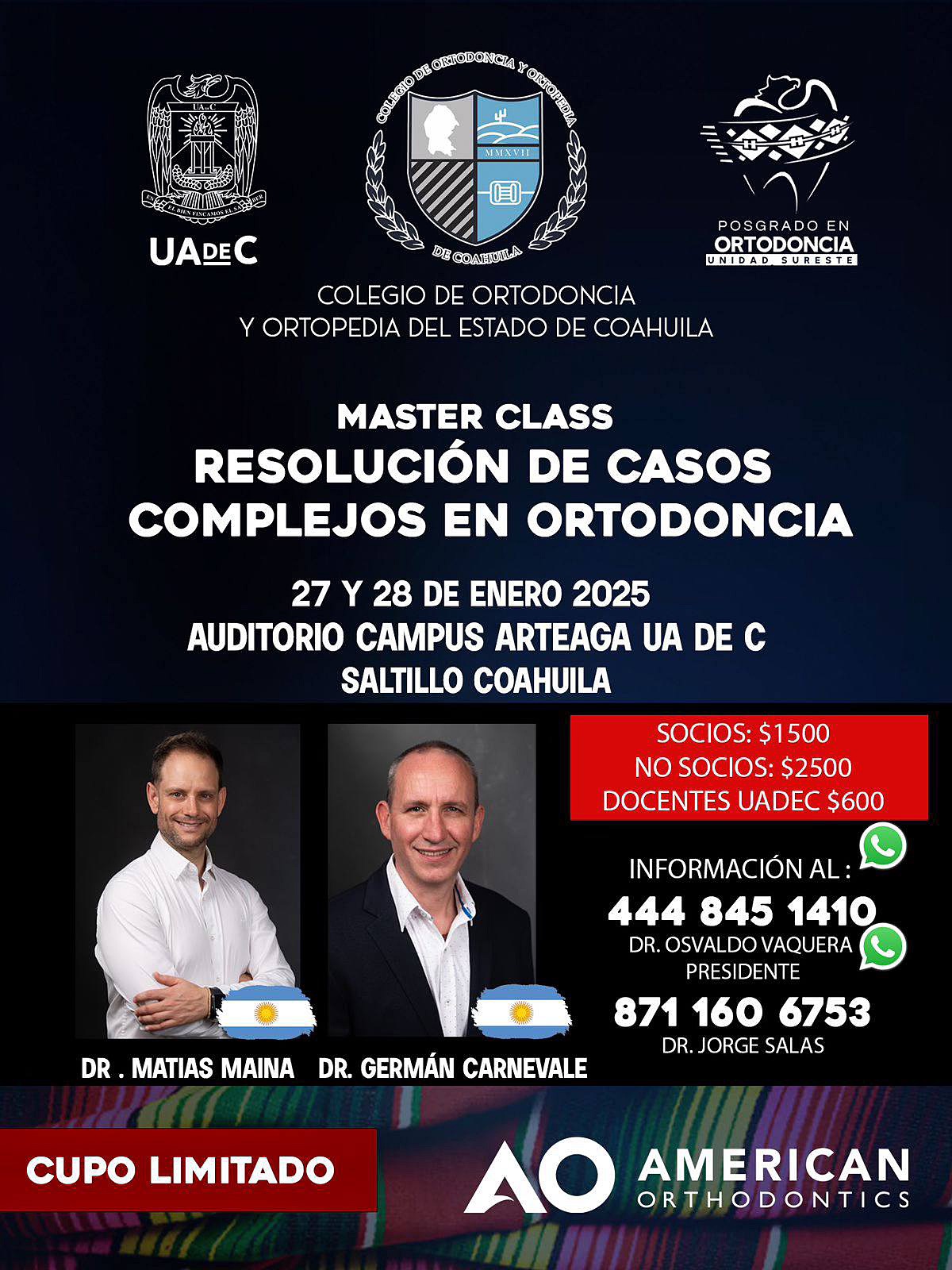 SALTILLO, Coahuila. 13 de enero de 2025. La Universidad Autónoma de Coahuila, a través del Posgrado en Ortodoncia de la Facultad de OdontologíaUnidad Sureste y en colaboración con el Colegio de Ortodoncia y Ortopedia del estado de Coahuila, llevará a cabo la Master Class titulada «Resolución de Casos Complejos en Ortodoncia» los días 27 y 28 de enero de 2025 en la Infoteca del Campus Arteaga.