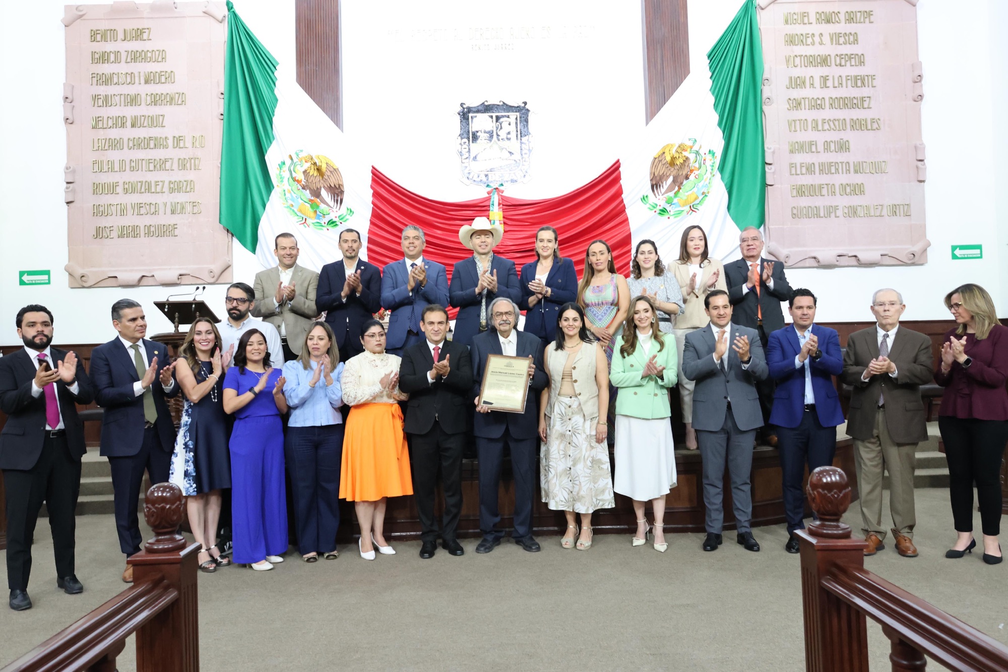 Al finalizar este pronunciamiento, la Diputada Luz Elena Morales Núñez, Presidenta de la Junta de Gobierno del Congreso y el Diputado Álvaro Moreira Valdés, entregaron al homenajeado un reconocimiento a nombre de las Diputadas y Diputados integrantes de la LXIII Legislatura.