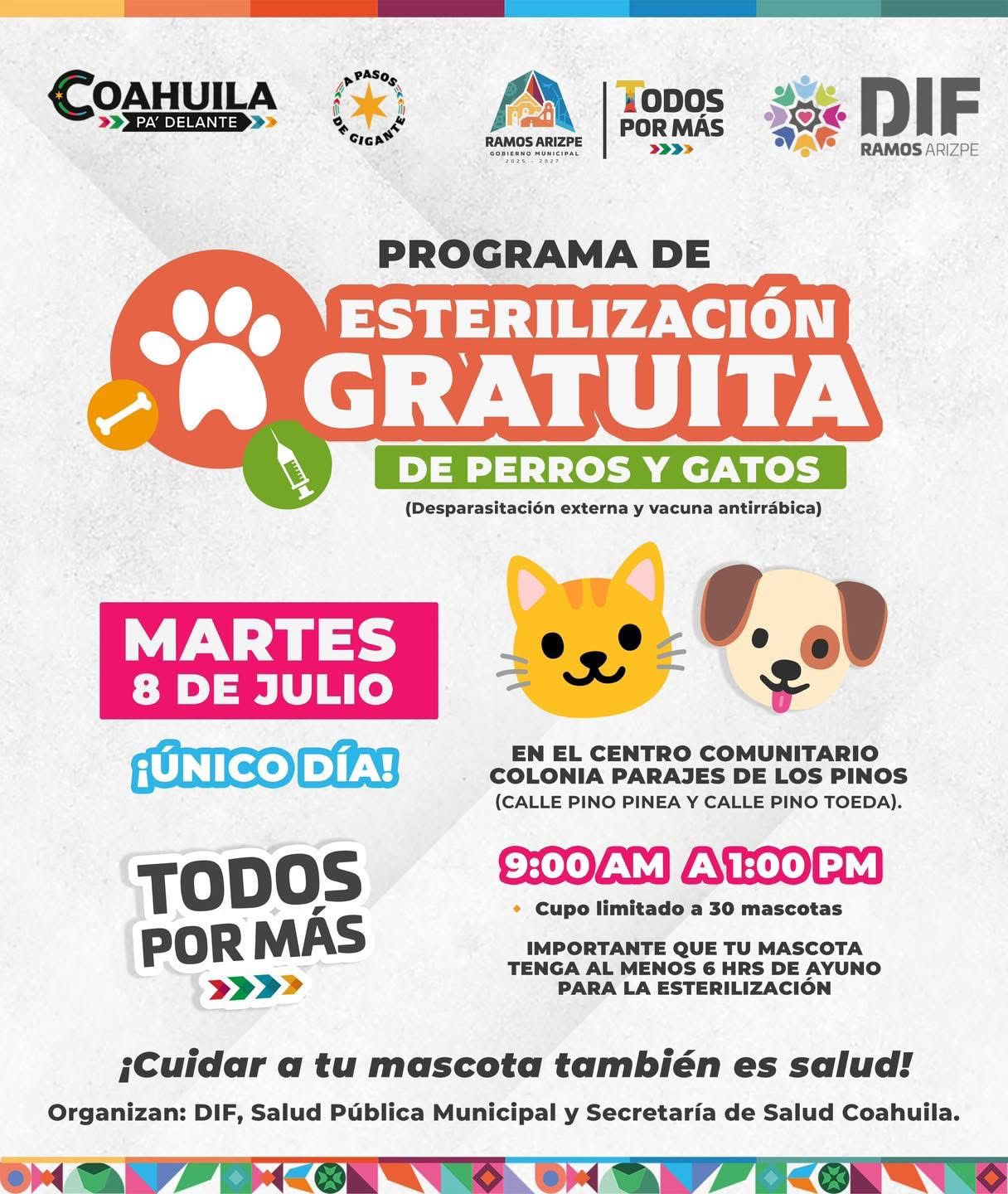Ramos Arizpe, Coahuila de Zaragoza; 7 de julio de 2025.- Este martes 8 de julio se llevará a cabo una jornada gratuita de esterilización de perros y gatos en el Centro Comunitario de la colonia Parajes de Los Pinos, ubicado entre las calles Pino Pinea y Pino Toeda.