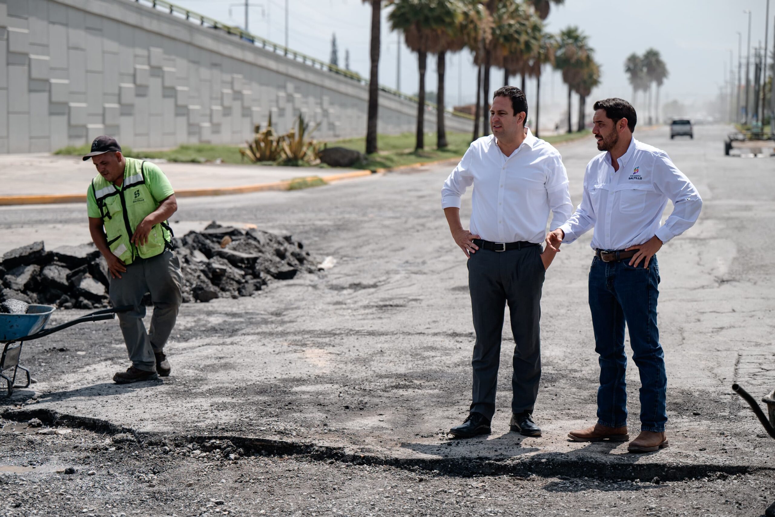Asimismo, el Presidente Municipal, acompañado por diferentes brigadas municipales, recorrió parte del bulevar Luis Donaldo Colosio a la altura del fraccionamiento Villa Bonita, donde se dañó considerablemente el pavimento y se acumuló gran cantidad de escombro, que afectó parte de la vialidad en su sentido de poniente a oriente.