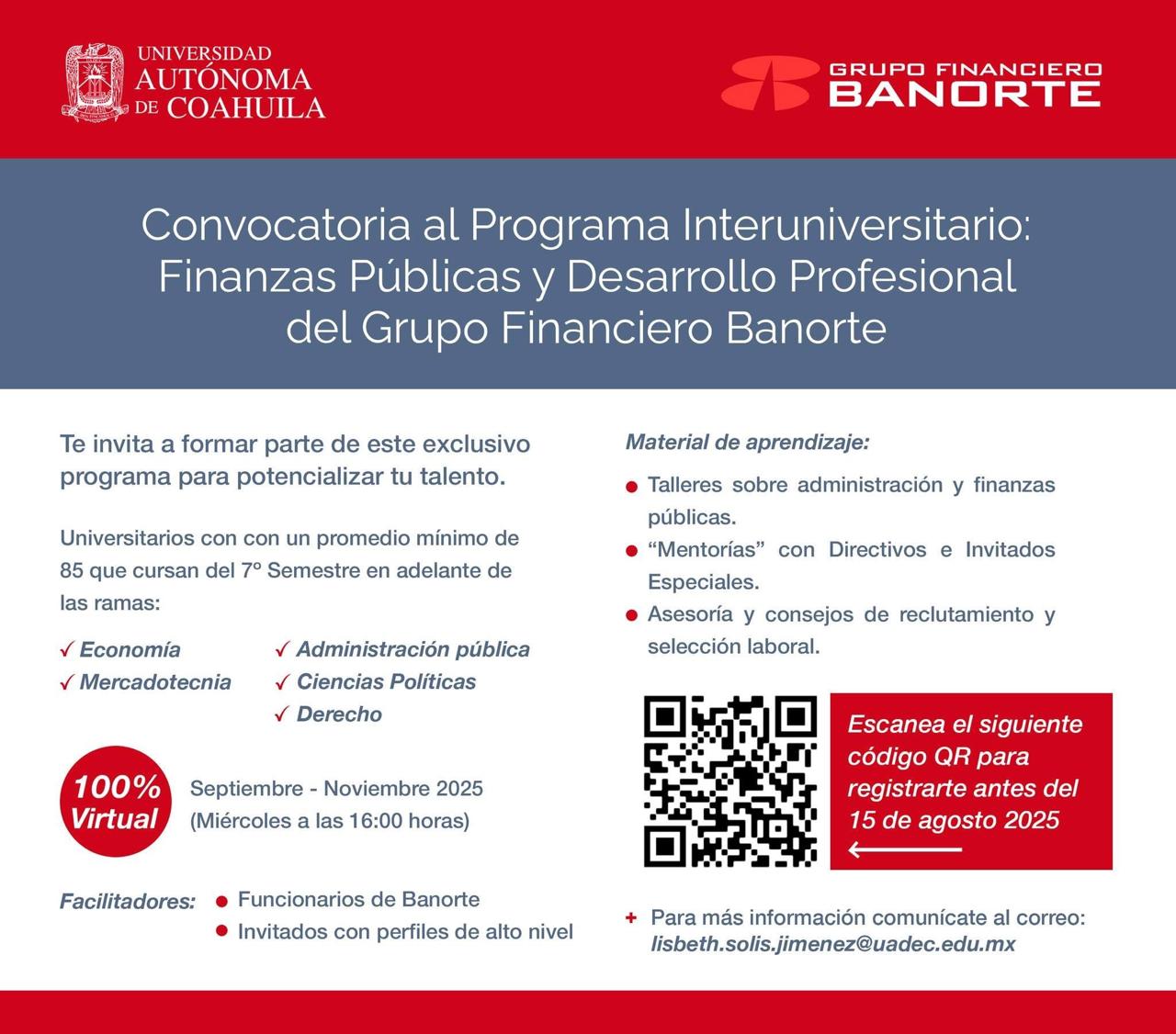 La Universidad Autónoma de Coahuila invita a sus estudiantes a potencializar su talento y participar en la Convocatoria Programa Interuniversitario: Finanzas Públicas y Desarrollo Profesional del Grupo Financiero Banorte.