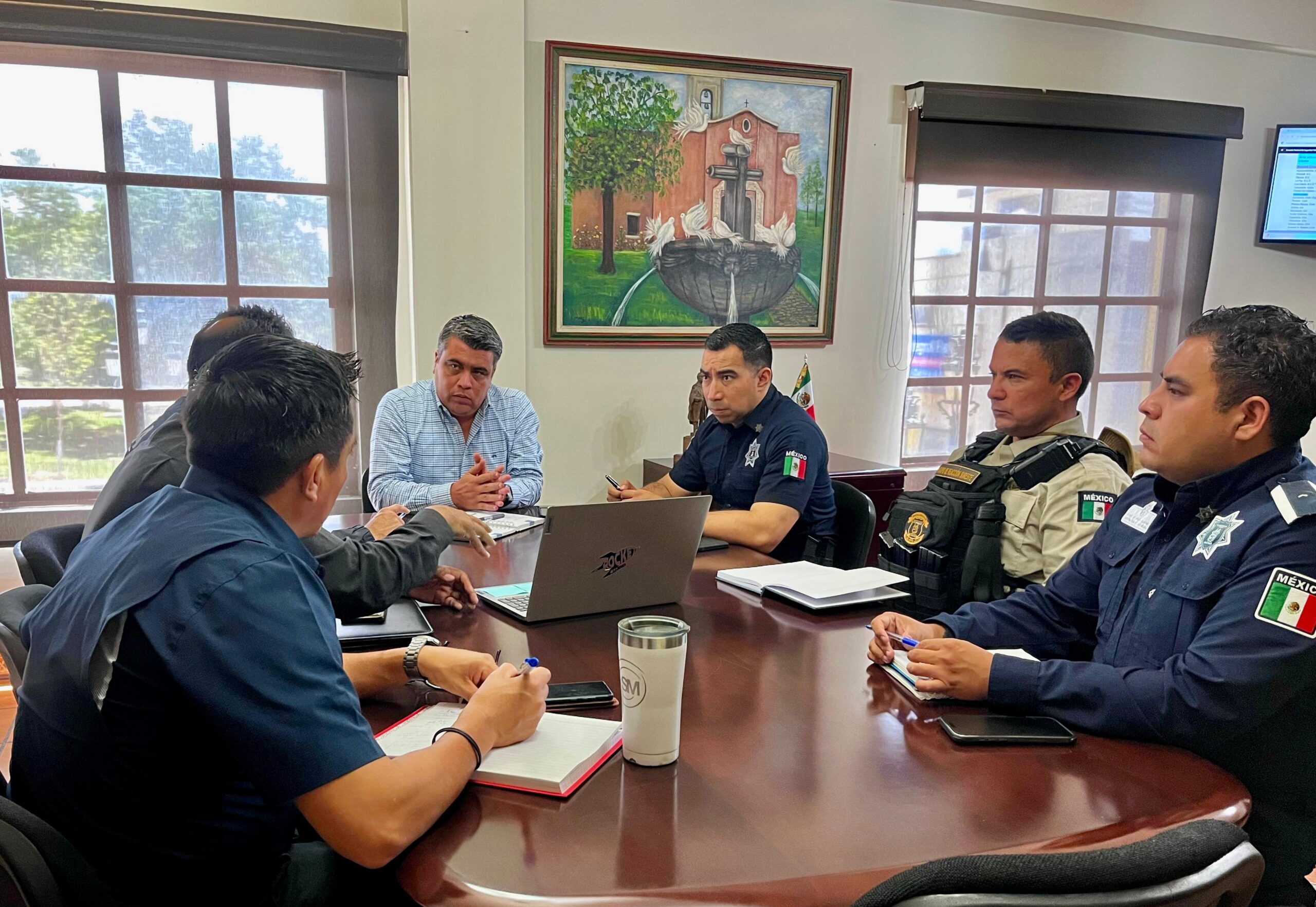 Por instrucciones del alcalde, Tomás Gutiérrez Merino; el secretario del Ayuntamiento, Alejandro González Farías, y el director de Seguridad Pública Municipal, Rolando Álvarez Flores, se reunieron con el comisionado de Seguridad y Protección Ciudadana de Saltillo, Miguel Ángel Garza Félix y su equipo de trabajo, con el objetivo de afianzar estrategias conjuntas que favorezcan el resguardo de la población y la protección de las inversiones.