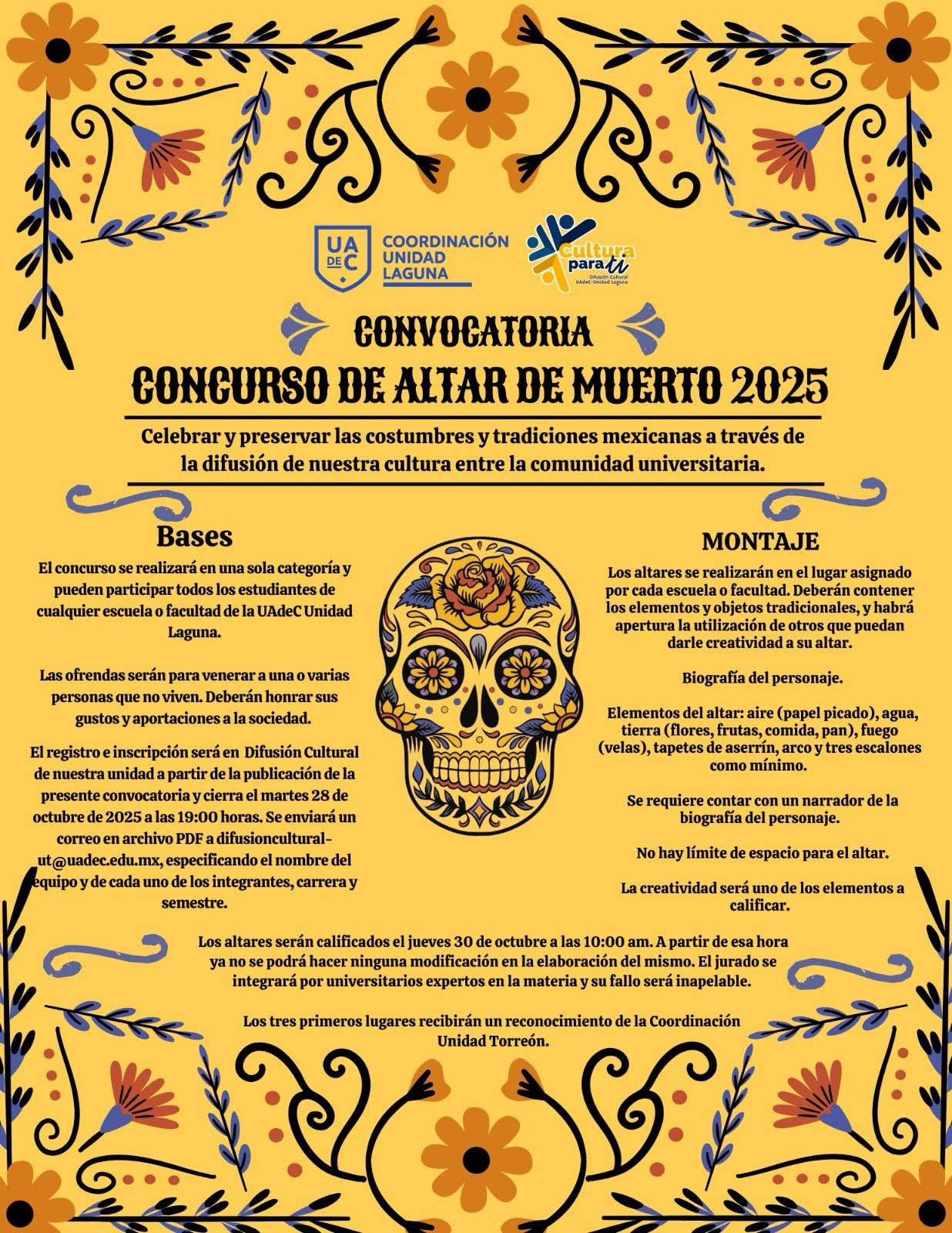 En la Unidad Laguna, la Coordinación de Unidad convoca al Concurso de Altar de Muertos 2025, dirigido a estudiantes de todas las escuelas y facultades, estainiciativa busca celebrar y preservar las tradiciones mexicanas a través de la elaboración de altares dedicados a personajes significativos.