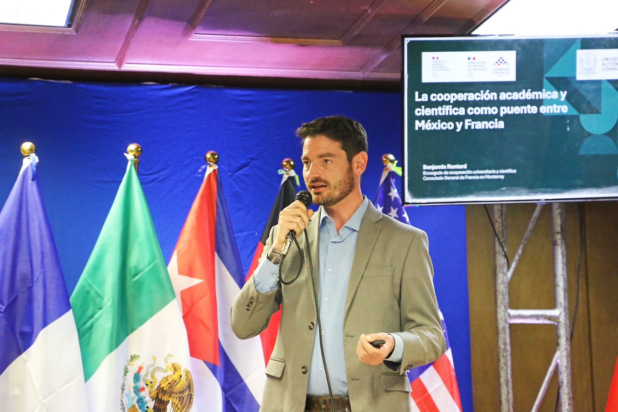 Para iniciar las actividades de la Jornada, se llevó a cabo la conferencia magistral “La cooperación académica y científica como puente entre México y Francia”, impartida por el Dr. Benjamín Rontard, encargado de Cooperación Universitaria y Científica del Consulado General de Francia en Monterrey; quien compartió que la internacionalización no debe entenderse únicamente como una tarea académica o un requisito curricular, sino como una oportunidad de crecimiento personal y profesional, tanto para estudiantes como para profesores, al fomentar el intercambio de experiencias, conocimientos y perspectivas globales.