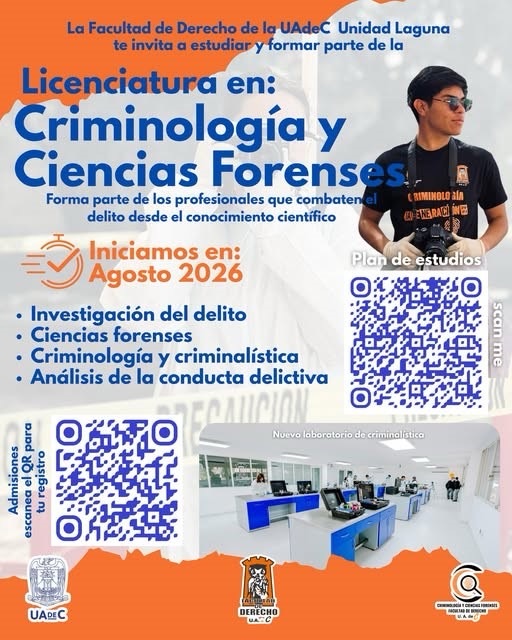 TORREÓN, Coahuila. 28 de enero de 2026. La Universidad Autónoma de Coahuila, a través de la Facultad de Derecho Unidad Laguna, invita a aspirantes interesados en el ámbito de la procuración e impartición de justicia a formar parte del proceso de admisión de agosto-diciembre 2026 e ingresar a la Licenciatura en Criminología y Ciencias Forenses.