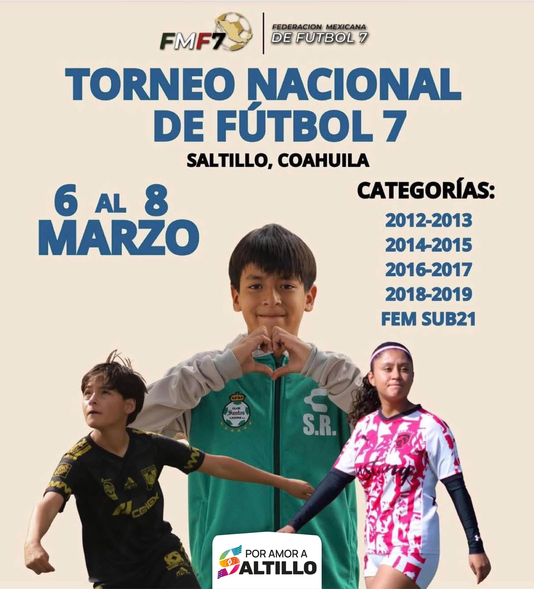 Omar Puentes Montes, director del Instituto Municipal de Cultura Física y Deporte, señaló que el Torneo Nacional de Fútbol 7 se competirá en las categorías 2012-2013, 2014-2015, 2016-2017, 2018-2019 y Femenil Sub21.